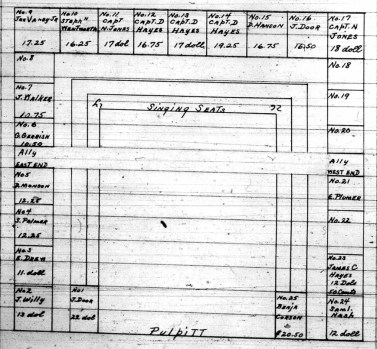 On the ground floor drawing or plan itself the 36 numbered pews are shown, labeled with their owners’ names and the price they paid. The sequence begins on the southerly to the right of the front door, runs up the easterly side, across the northerly side, down the westerly side, and back to the front door. No. 1,